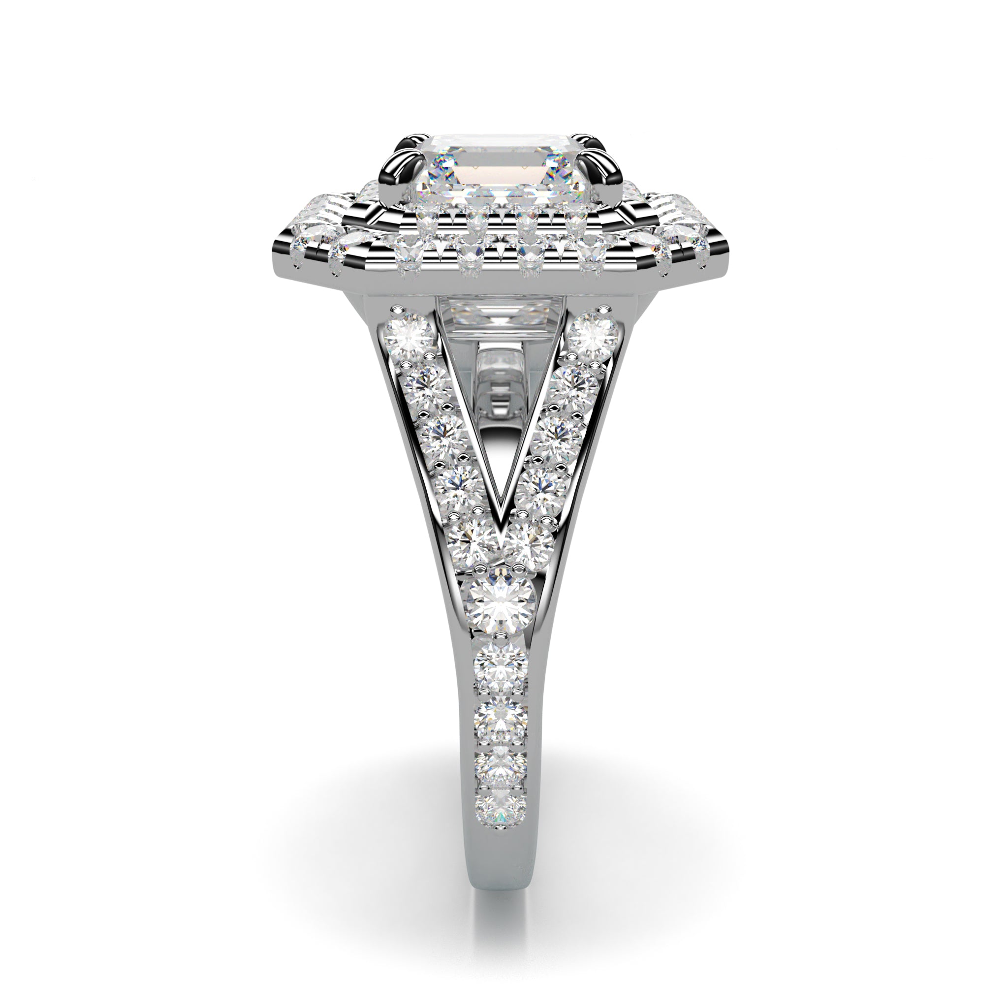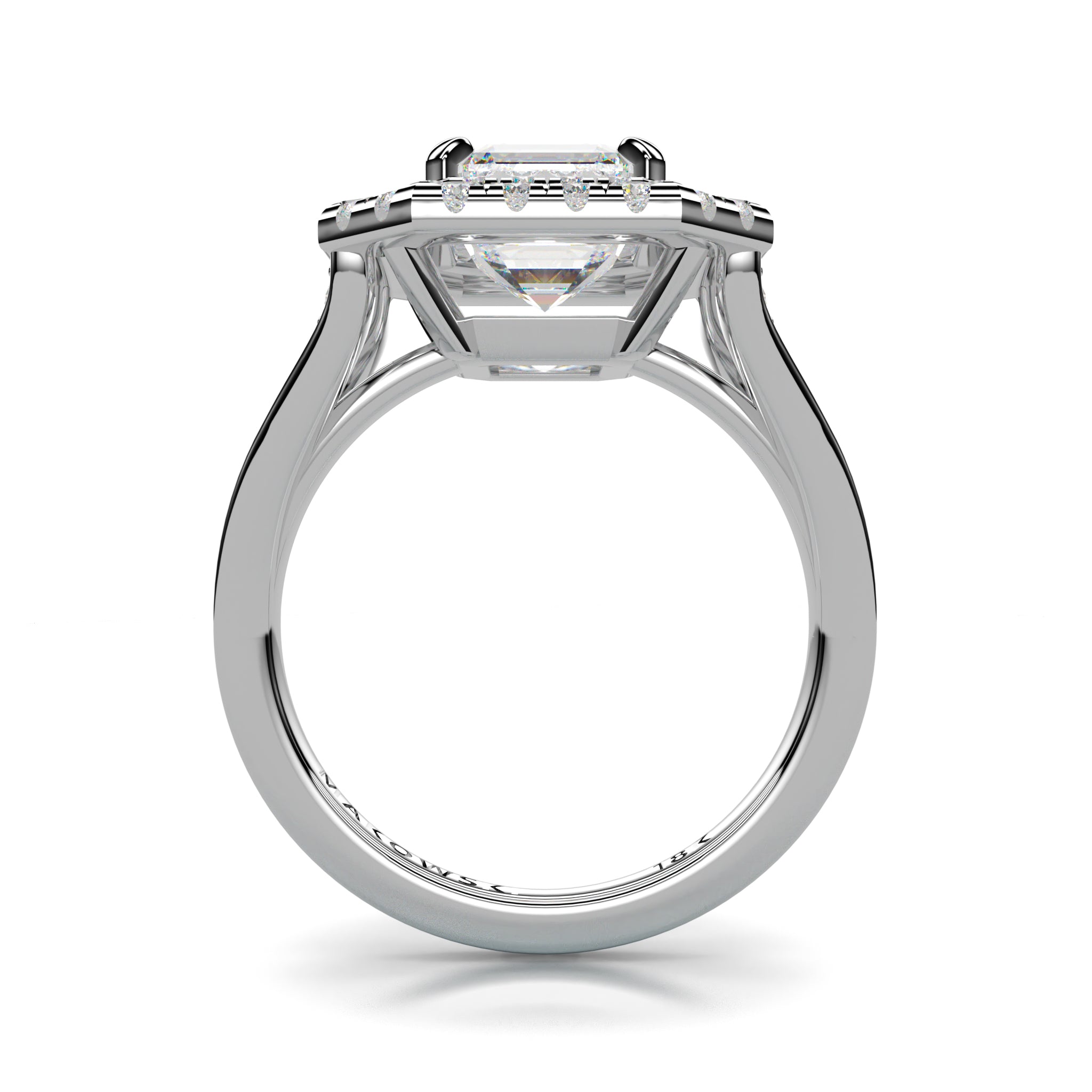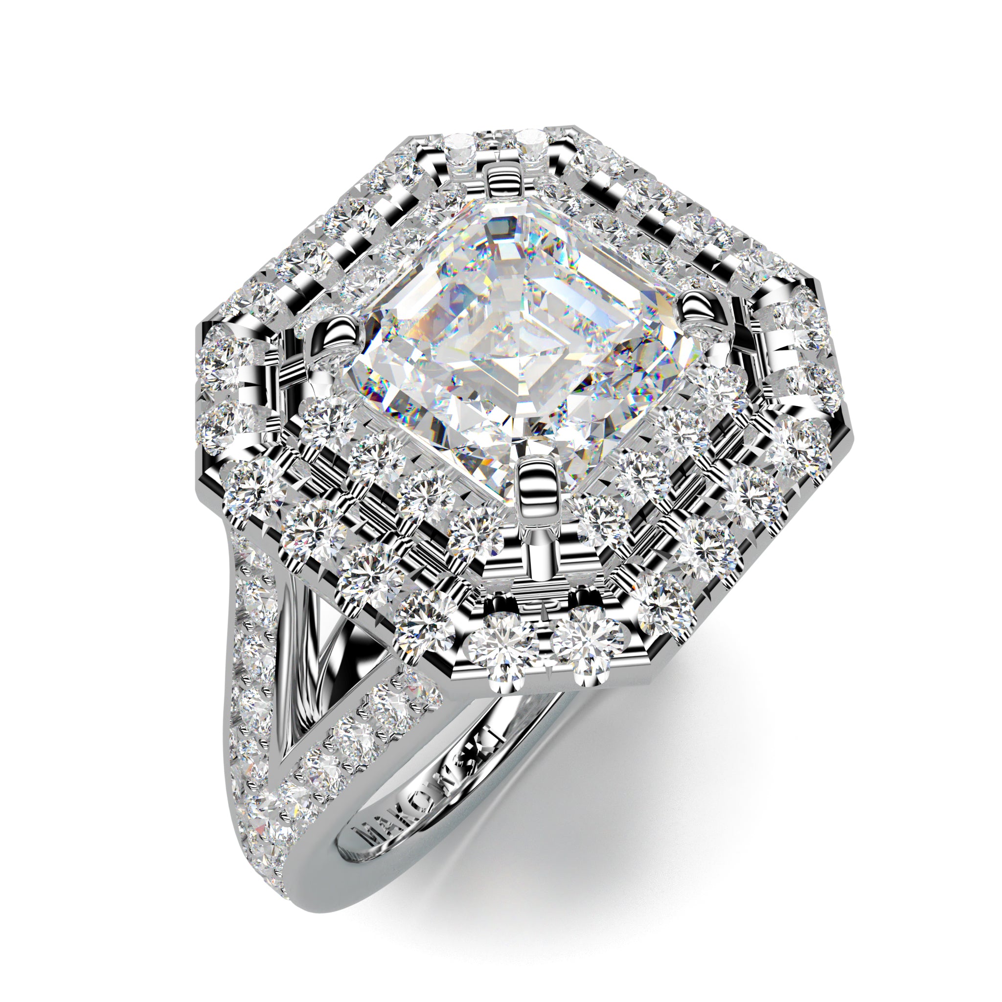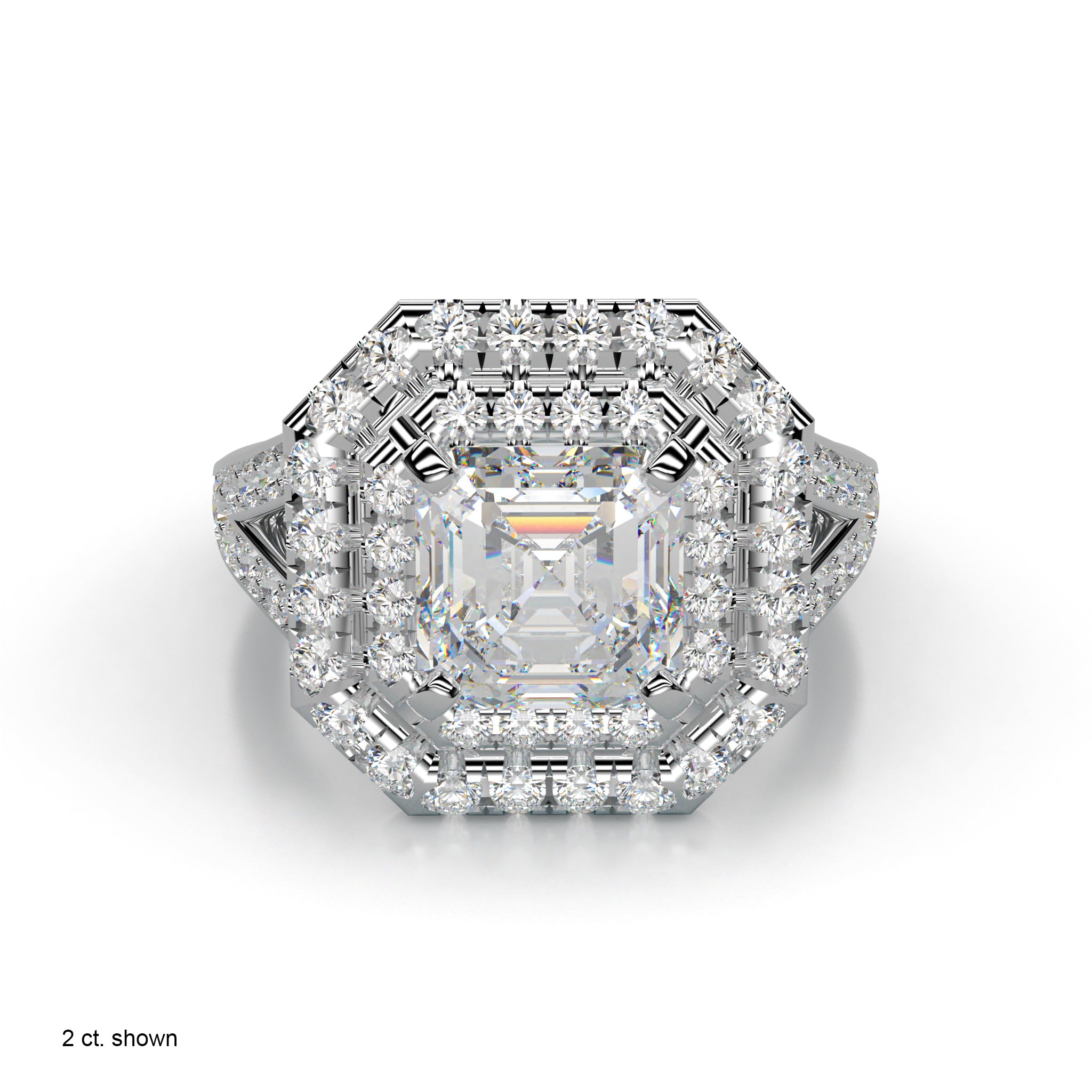 Square Diamond Engagement Ring With a Double Halo Setting and Accented Band