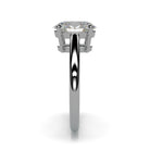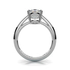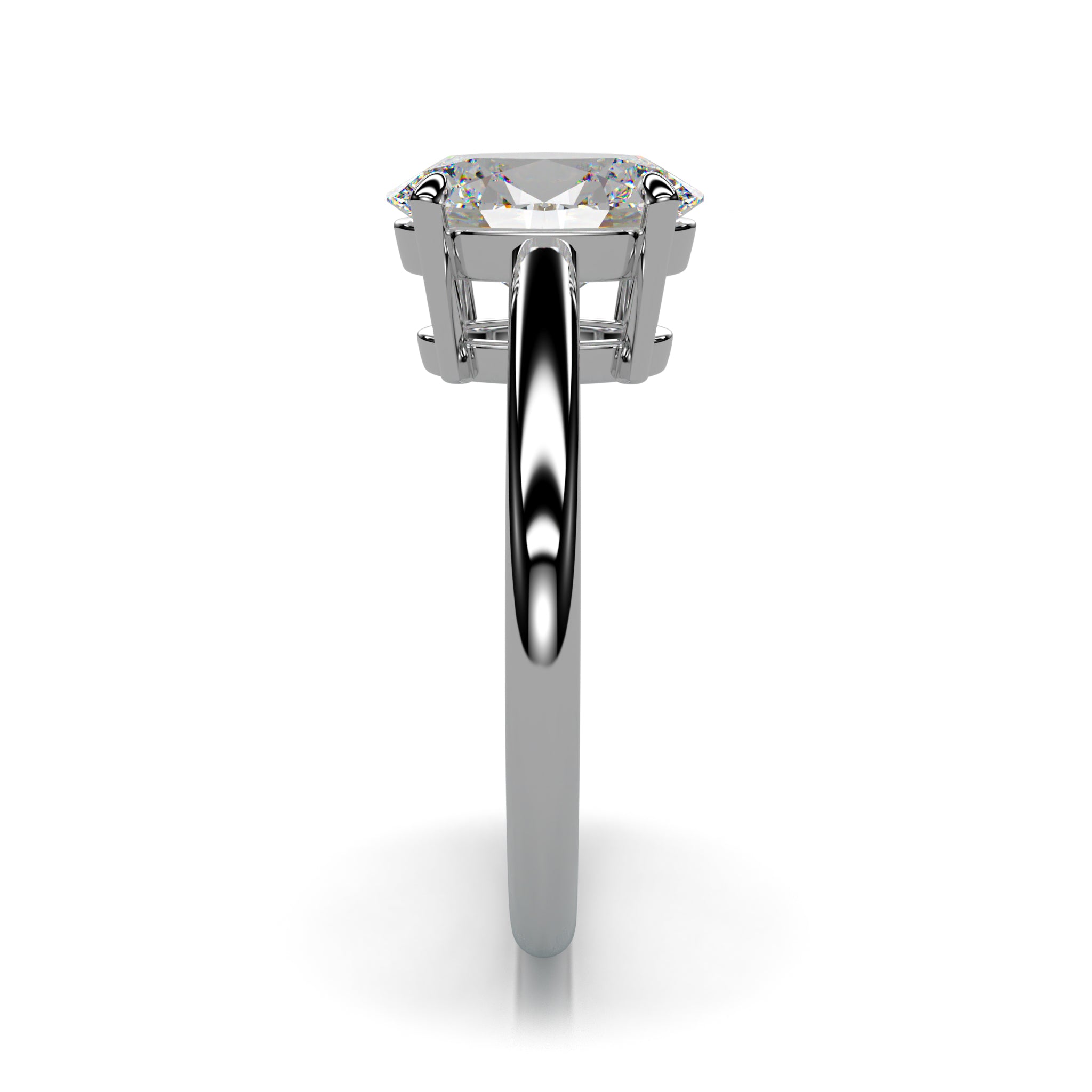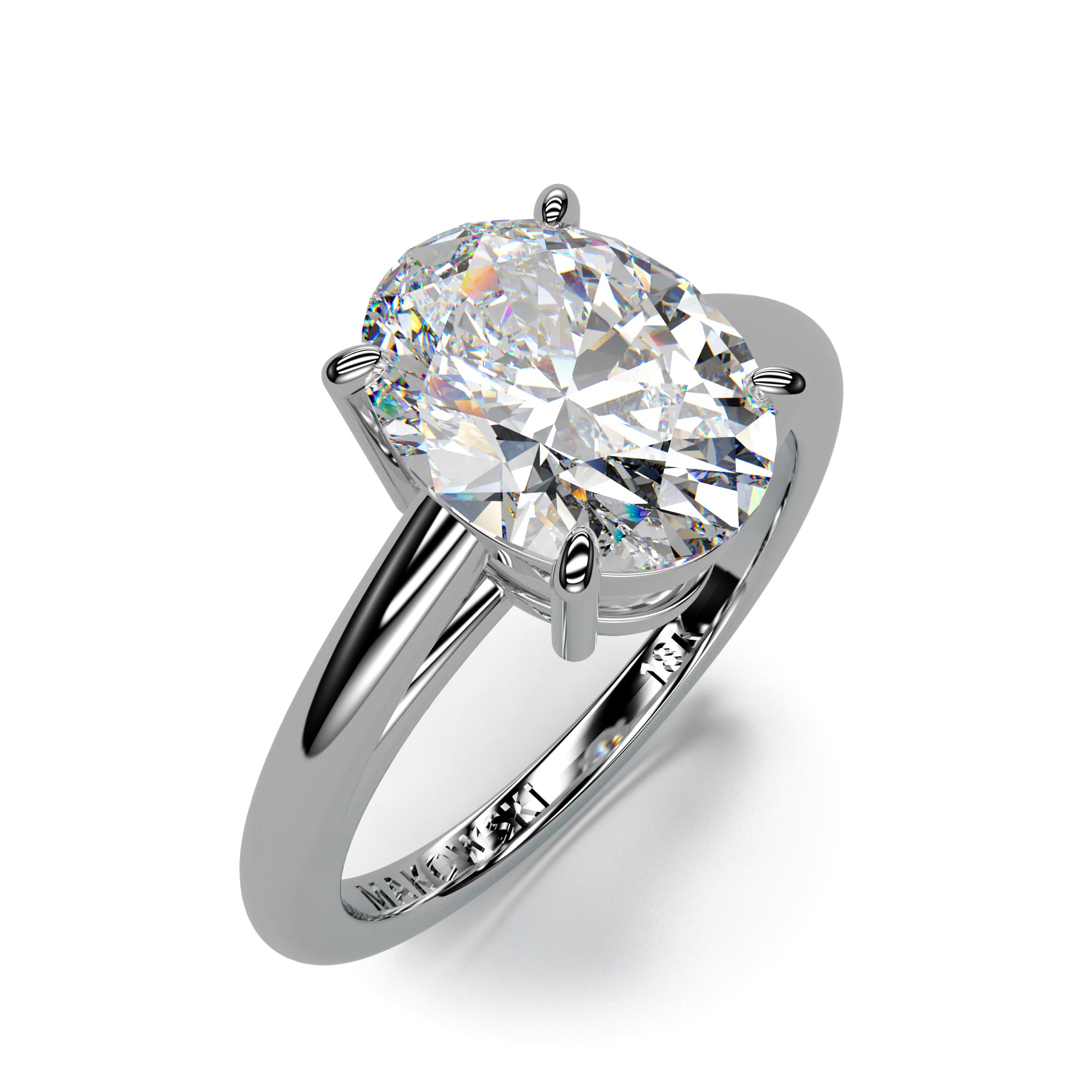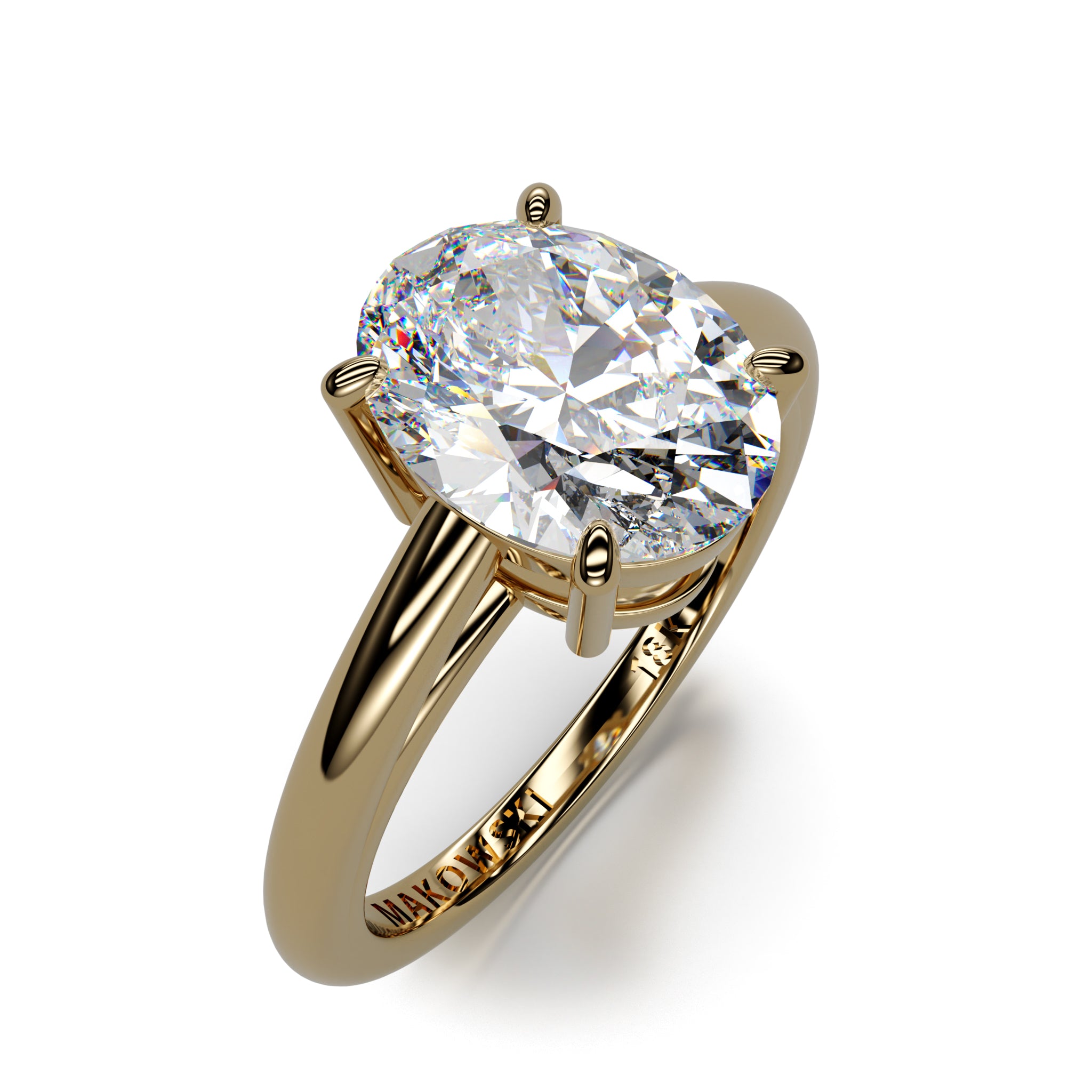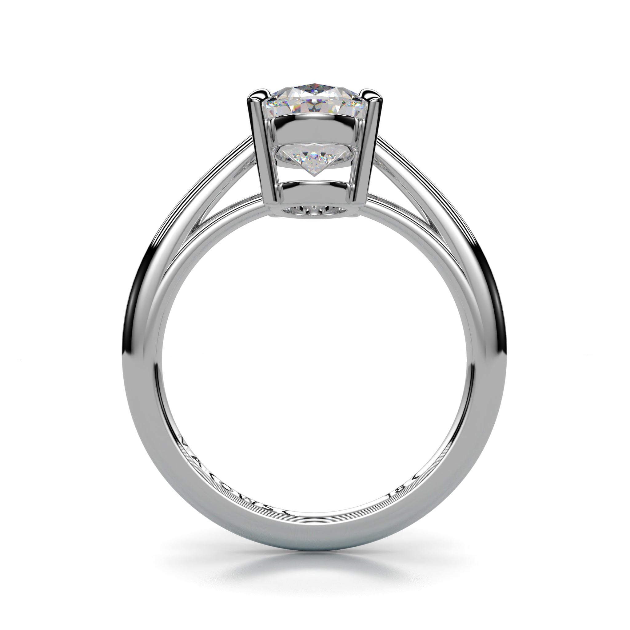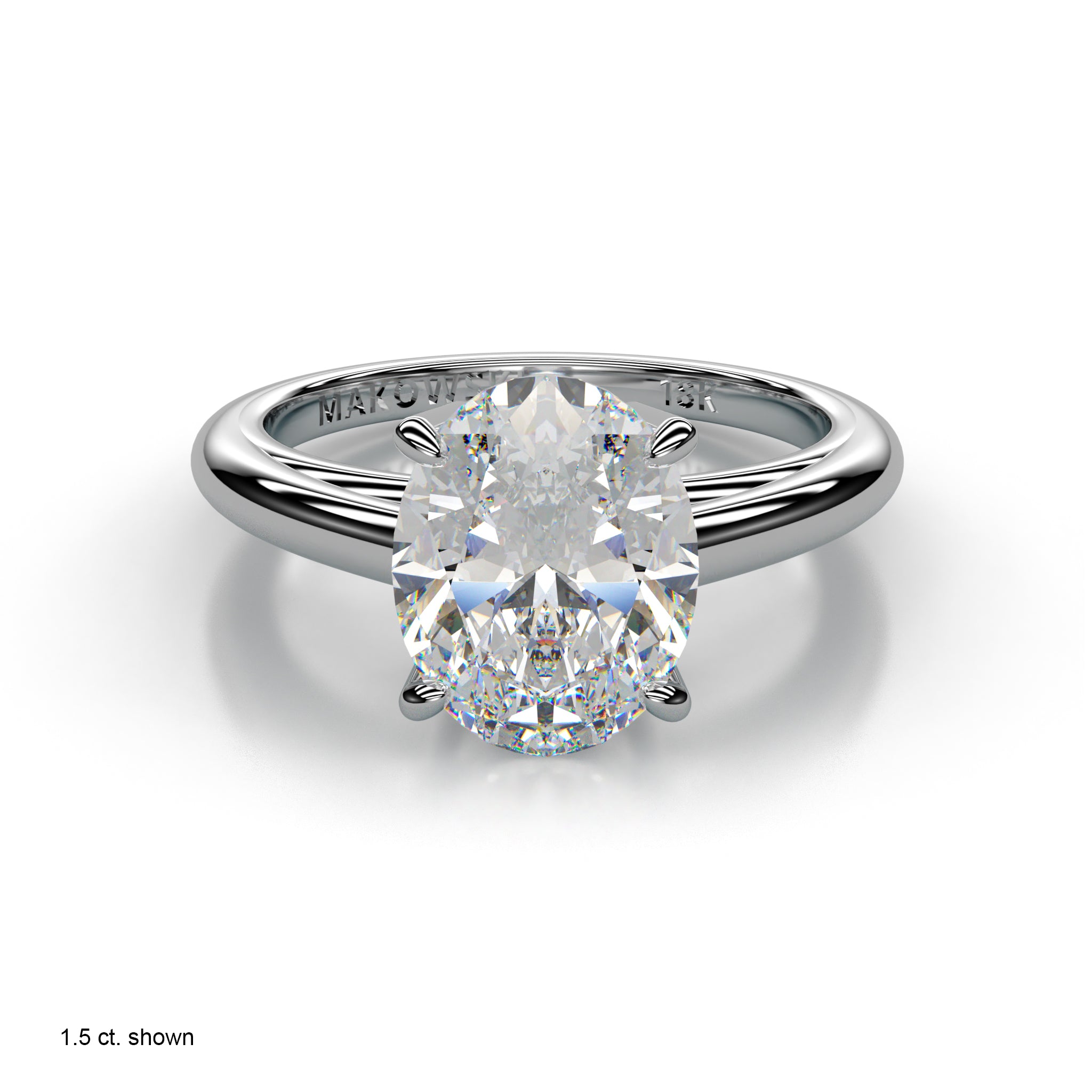 The Oval Center Diamond is set with four sleek prongs, giving this modern classic beautiful clean lines with a contemporary feel. A clean half round slender band makes the diamond stand out, giving this distinctly modern looking setting a romantic and classical sensibility.