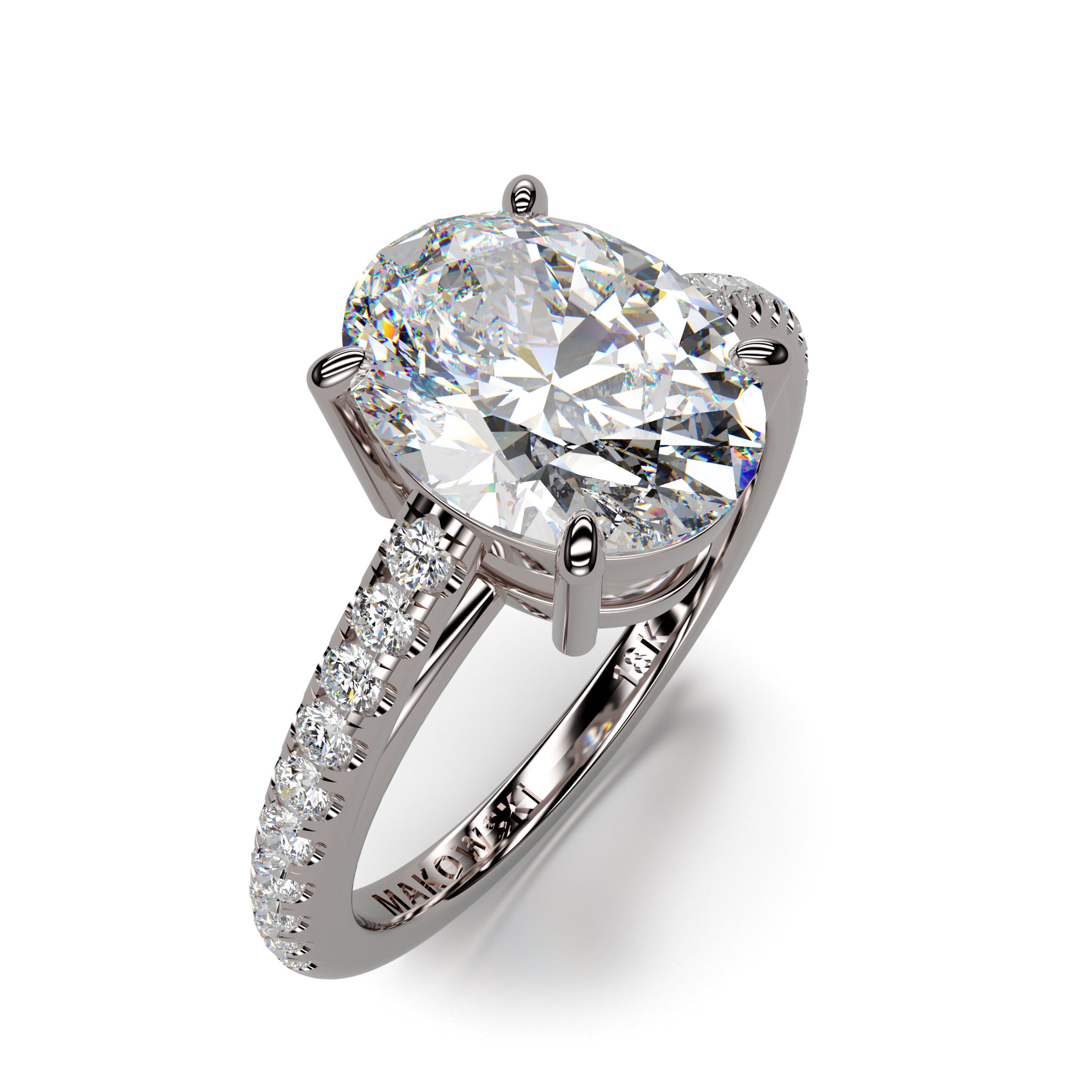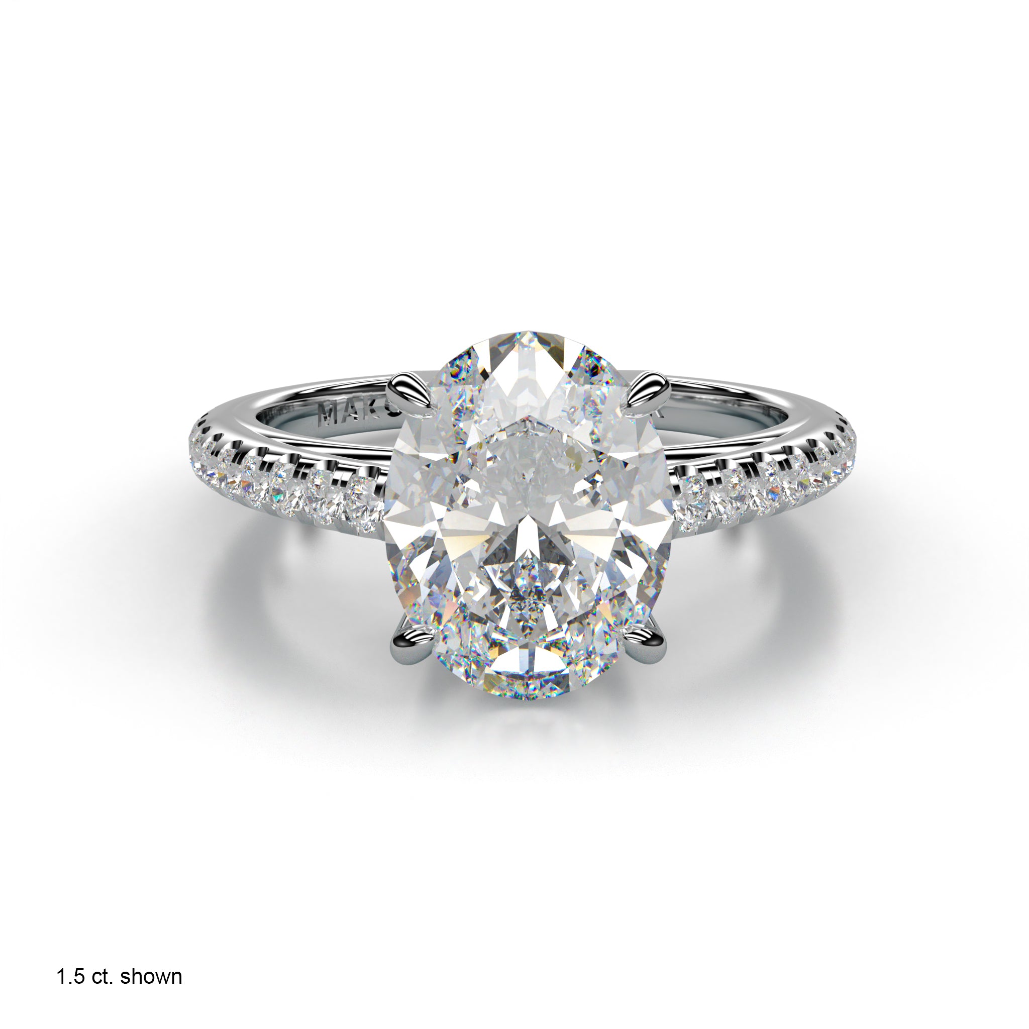 The Oval Center Diamond is set with four sleek prongs, giving this modern classic beautiful clean lines with a contemporary feel. A half round profile on a Cathedral style band makes the diamond stand out, giving this distinctly modern looking setting a romantic and classical sensibility. The Pave set diamond accents in the band gives the ring a beautiful and dazzling display of light, scintillation & fire.