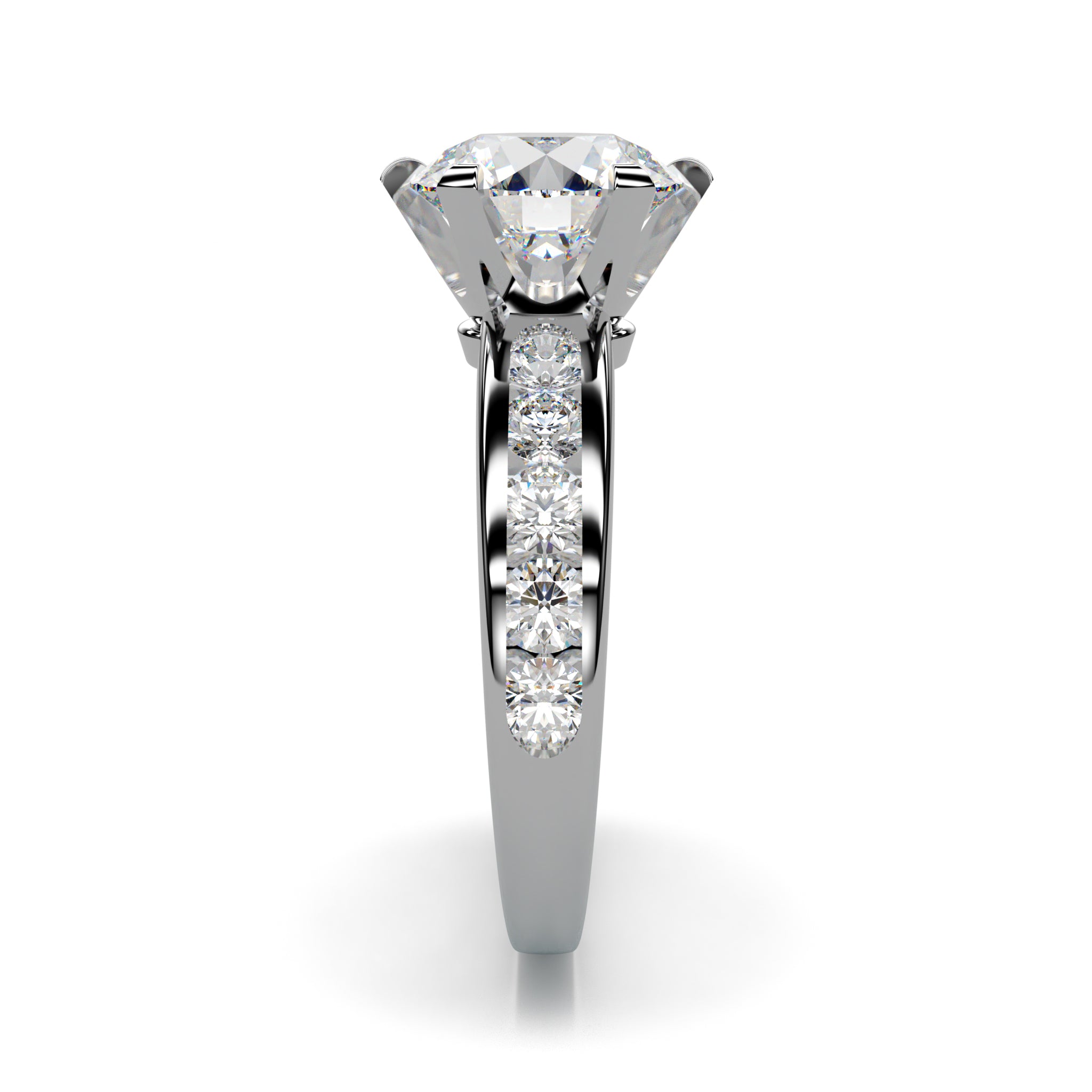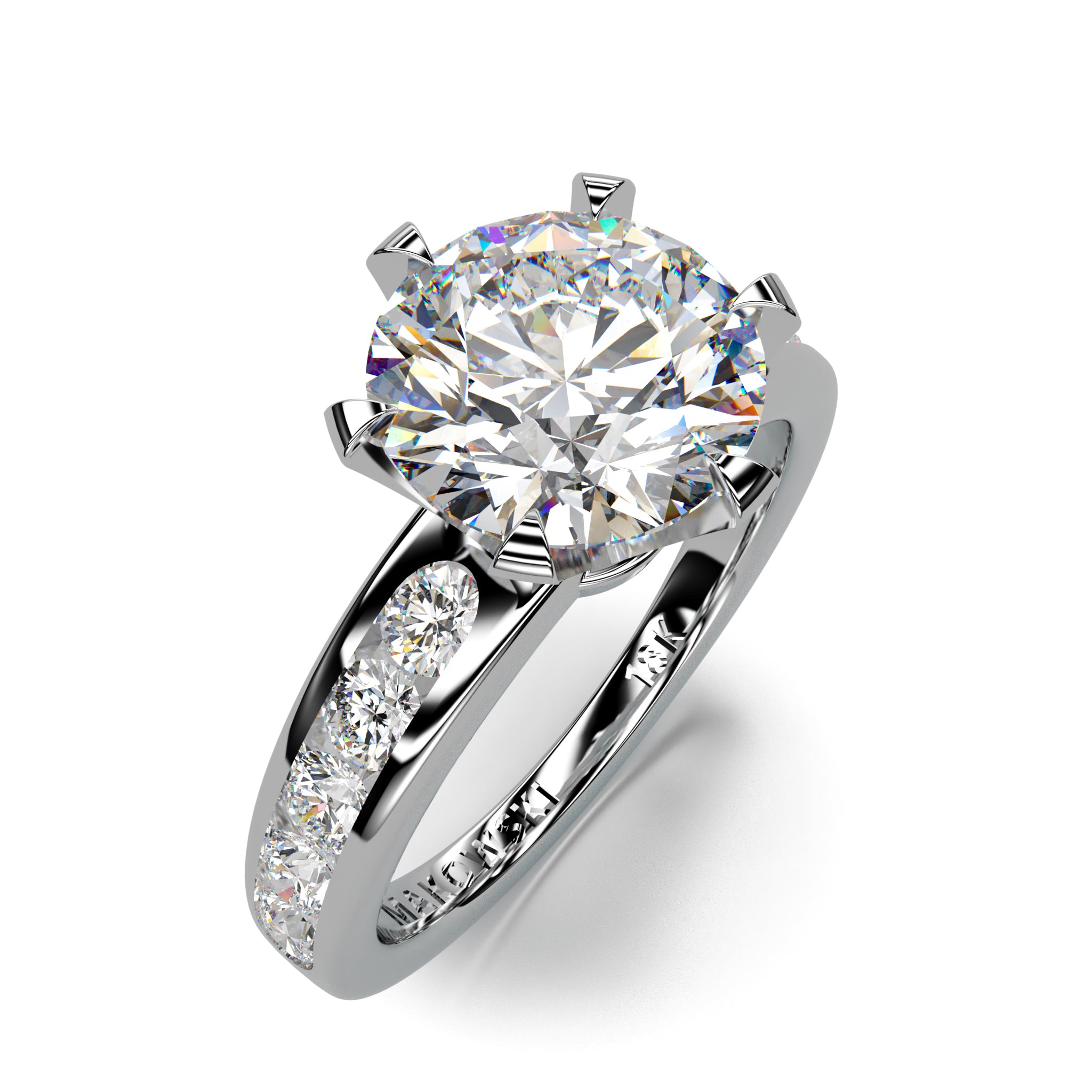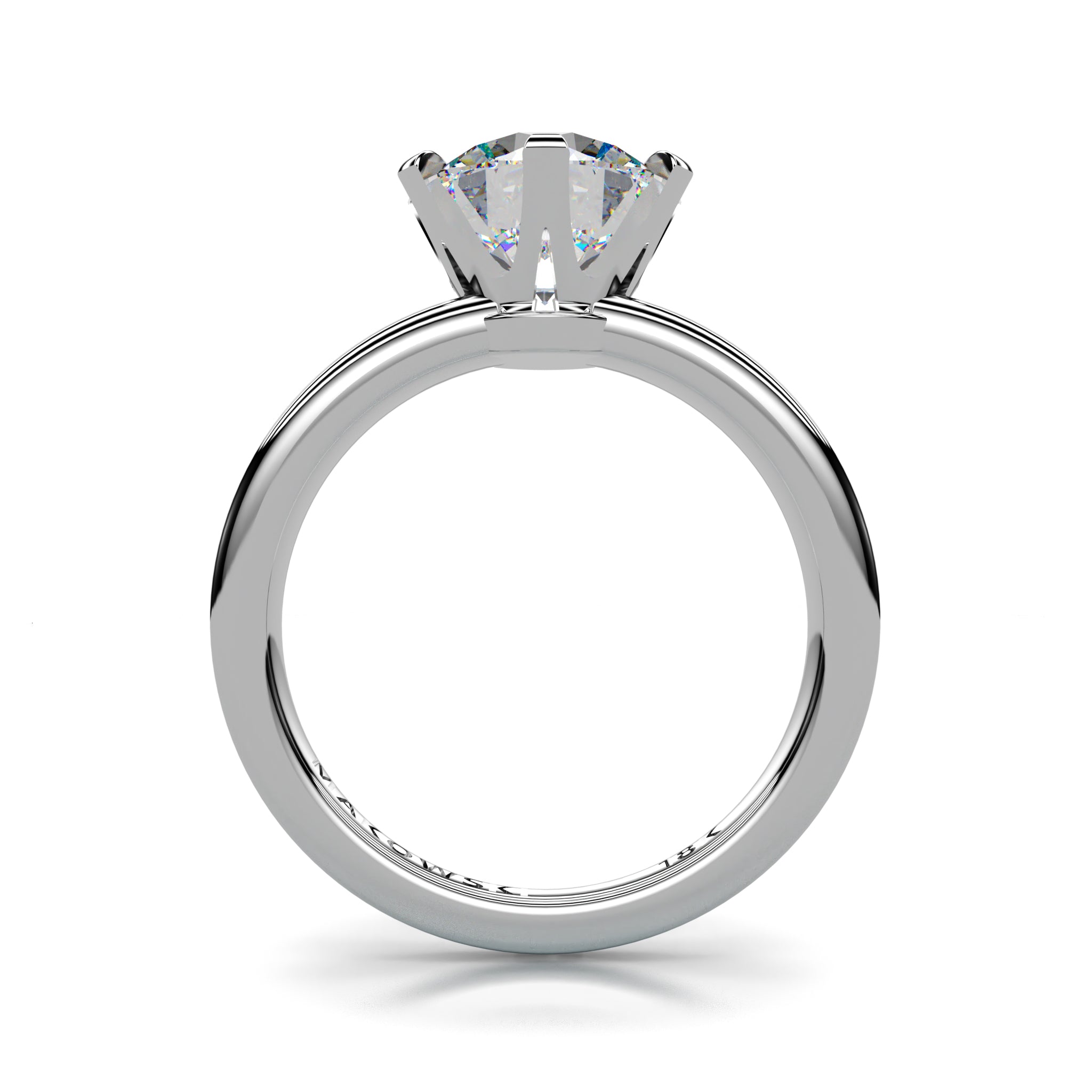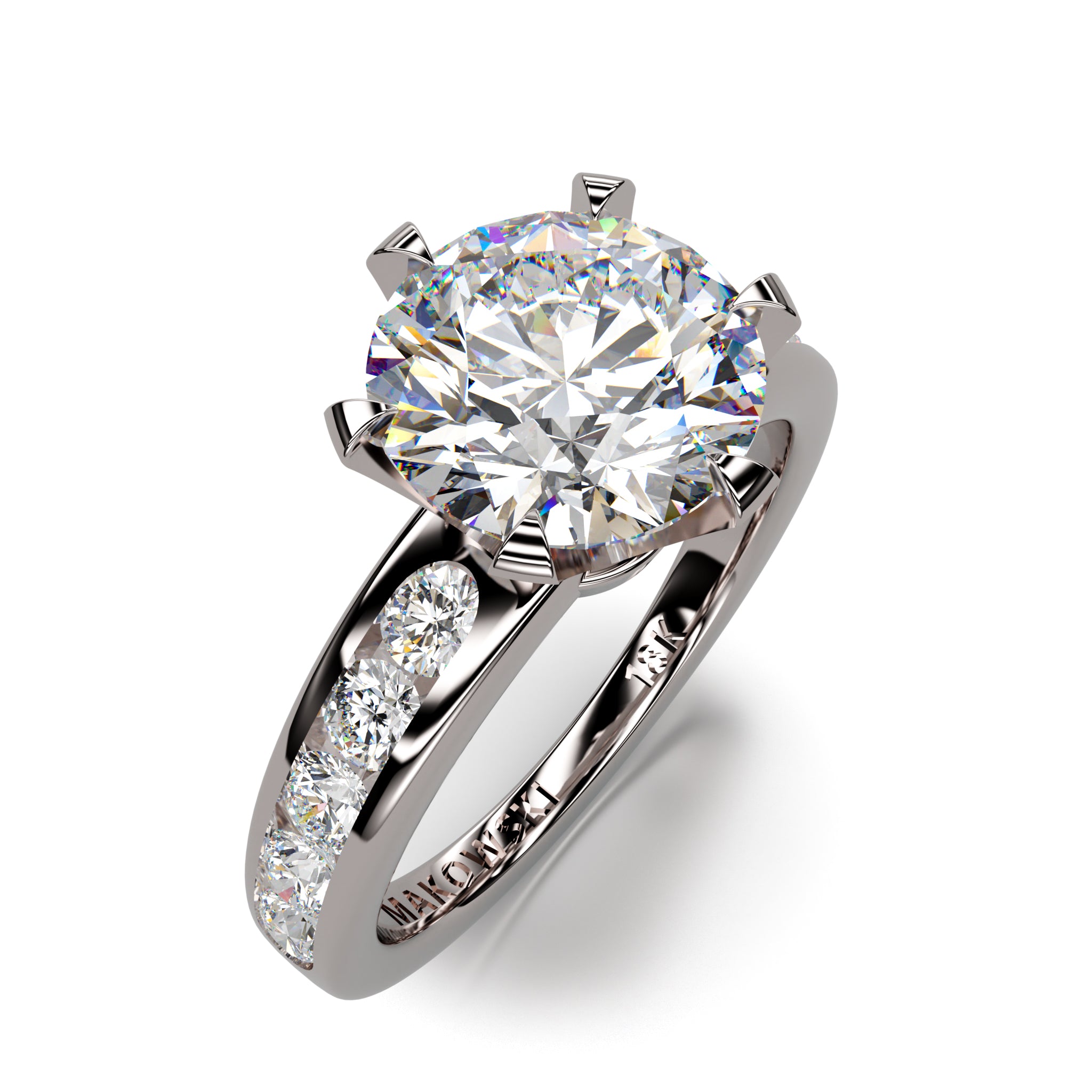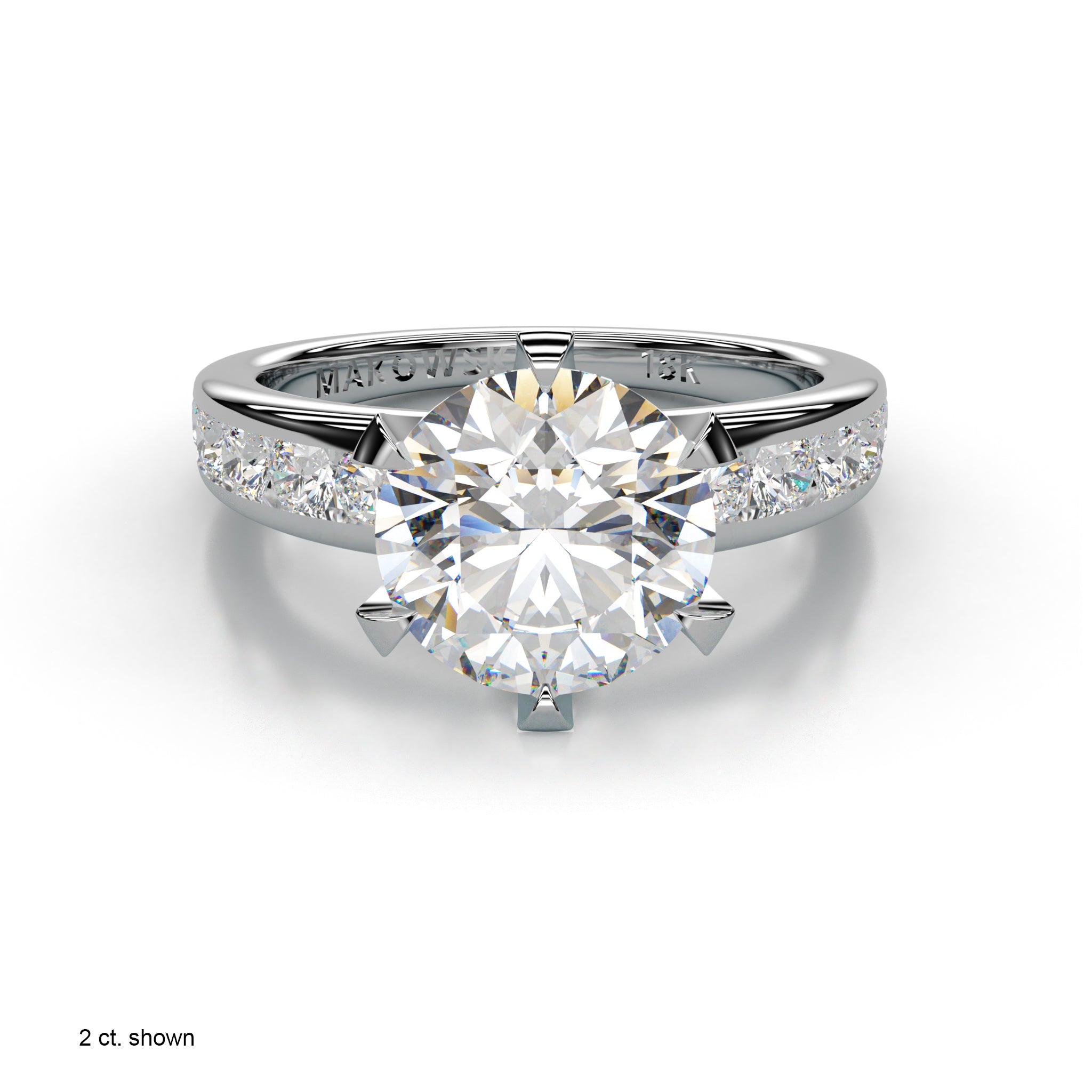 The Round Brilliant Center diamond is set with six sleek prongs, giving this modern classic beautiful clean lines with a contemporary feel. A graduated diamond band band makes the shank stand out, giving this distinctly modern looking setting a romantic and classical sensibility.