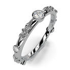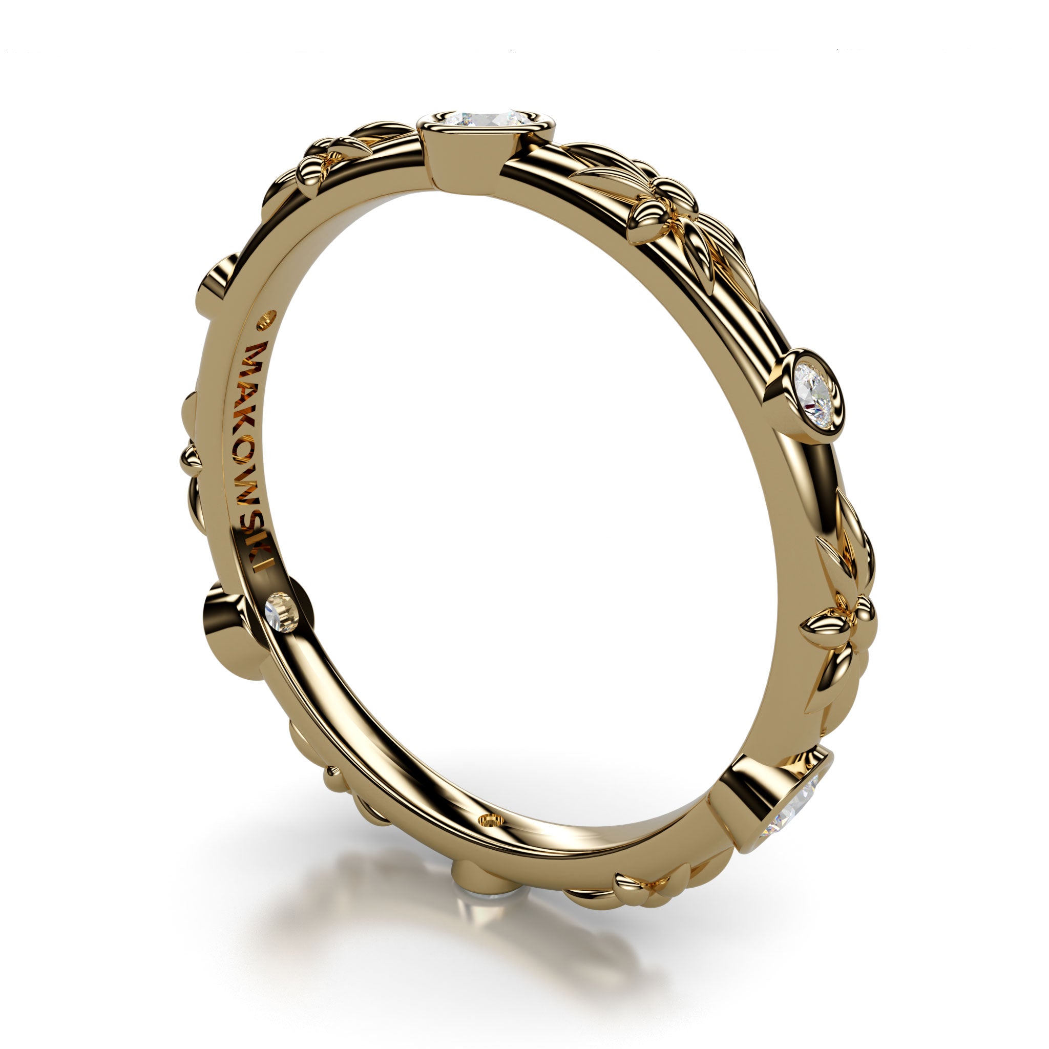 This beautiful stackable 18K diamond ring is adored with a floral design and round brilliant accent diamonds. Made to be worn with other stackable rings from the collection, this exquisitely hand crafted ring will provide a lifetime of pleasure and compliment all the other stackable rings and engagement from our collection.