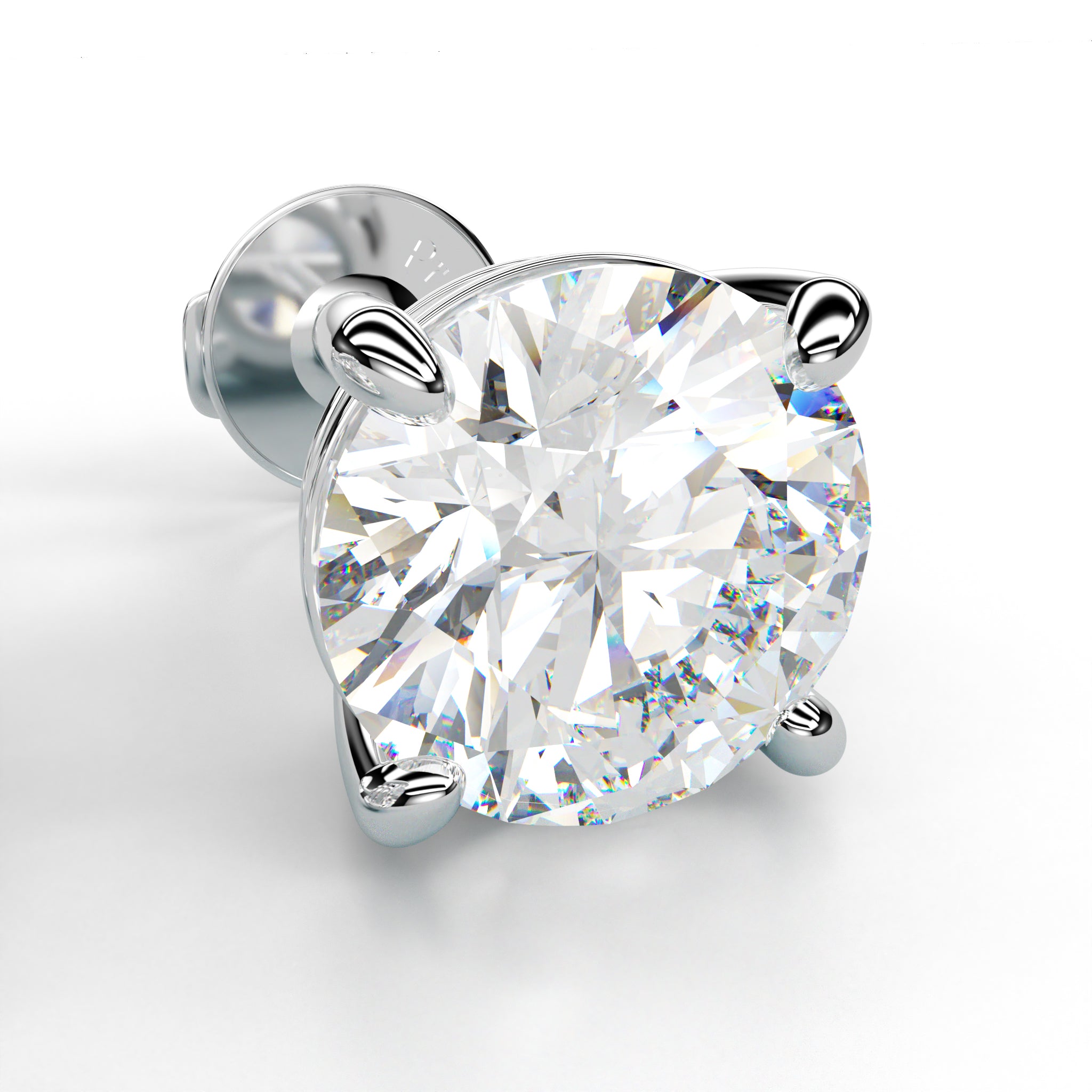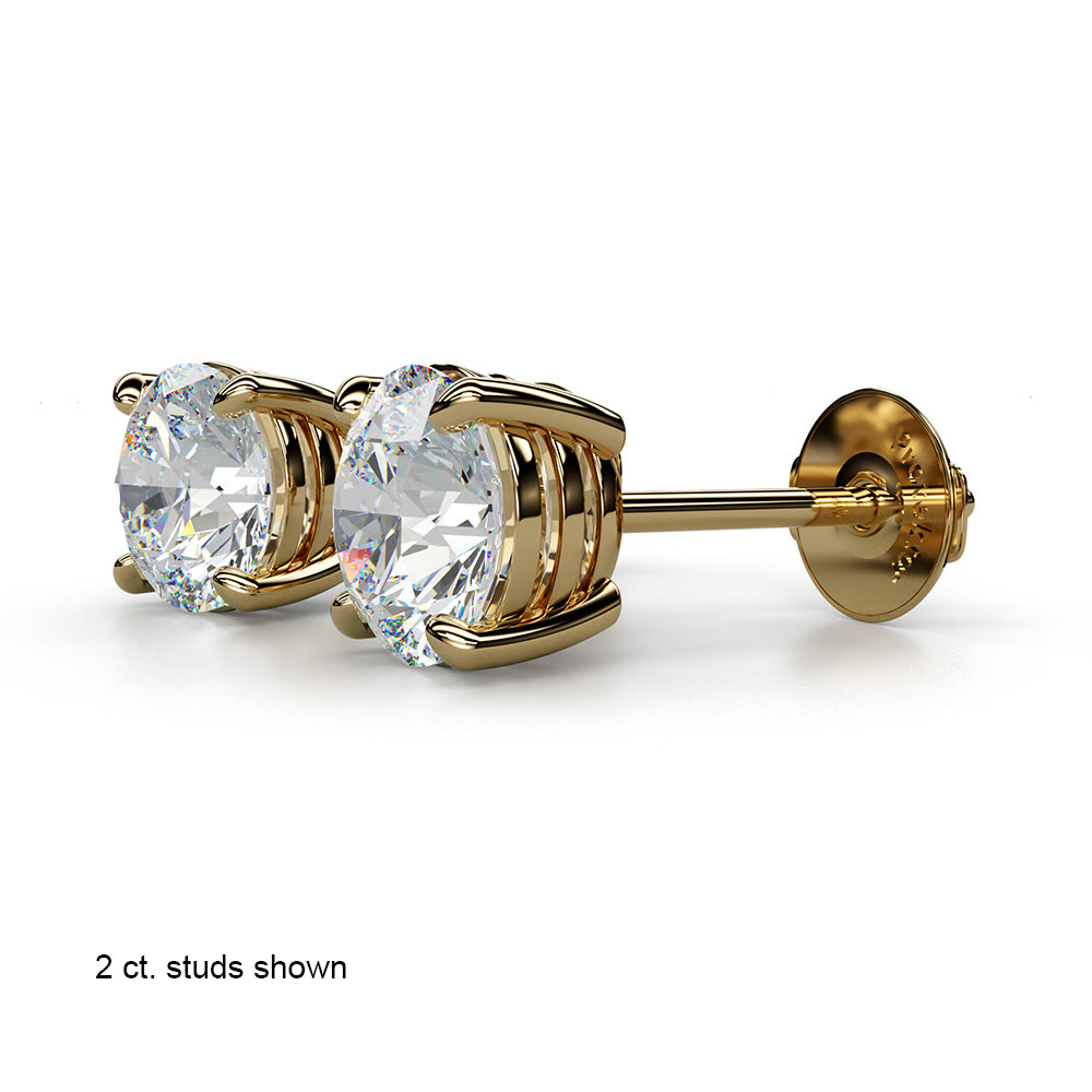 These beautiful stud earrings are custom made to order and set in a classic four prong basket setting with a modern three rail feature. The matched pair of round brilliant diamonds are certified and come with deluxe Protektor® backings or standard Push Back backings.