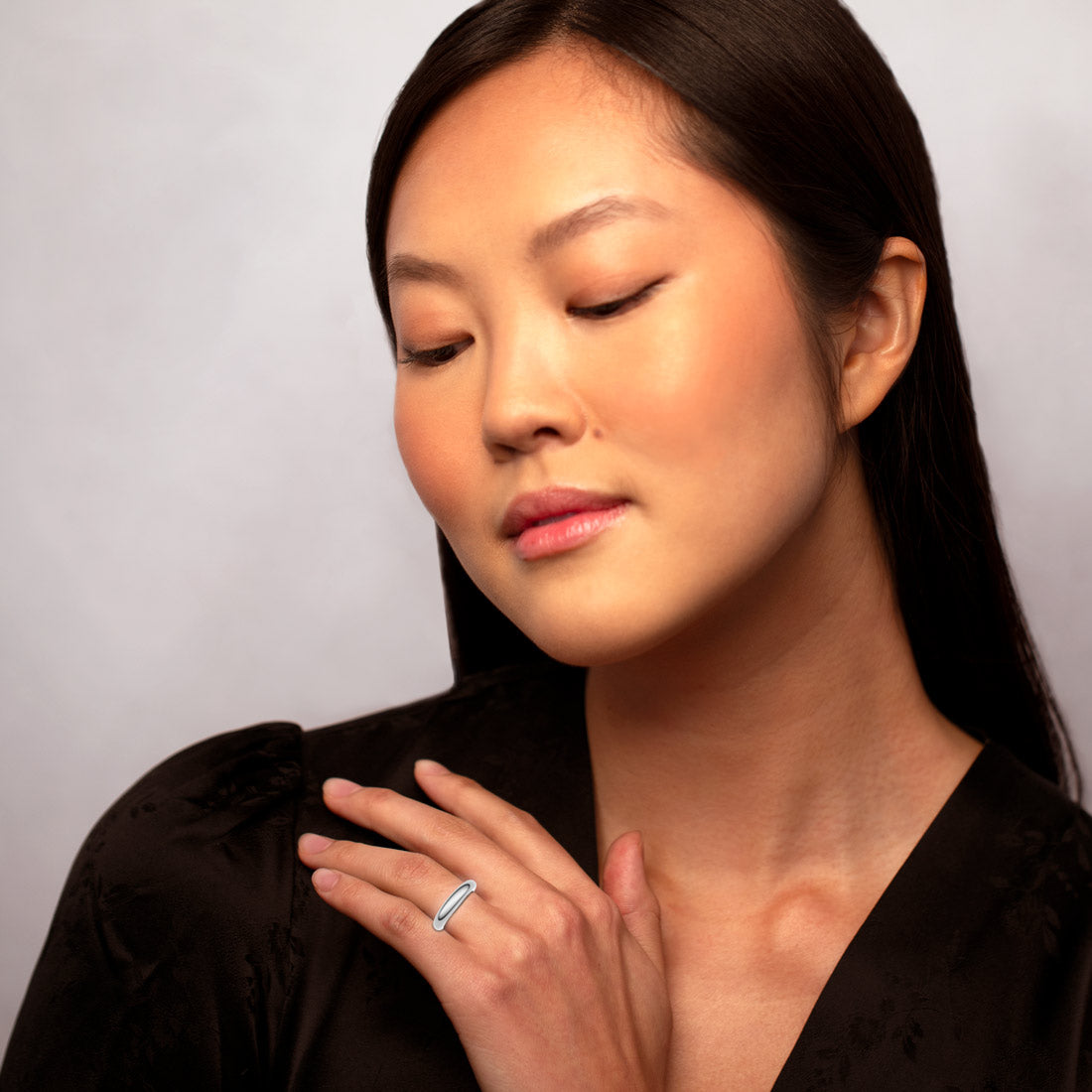 Its mirror-finish surface catches and reflects light with every movement, while the smooth interior and slim, rounded edges create a comfortable, low-profile fit ideal for everyday wear. Understated yet elevated, it works as a modern wedding band, a daily signature ring, or a stacking essential paired with more sculptural pieces from the Flow collection.